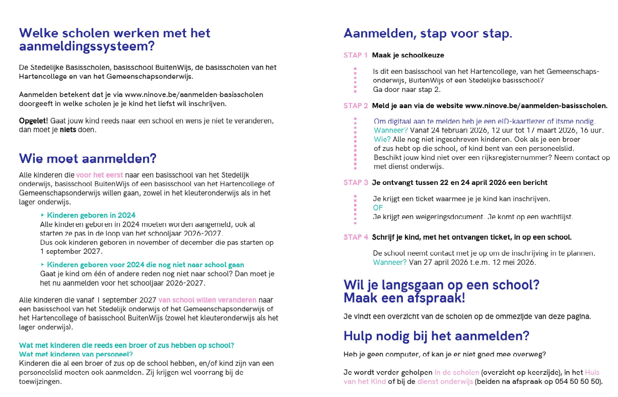 Binnen Ninove moet je sinds schooljaar 2023-2024 digitaal aanmelden vooraleer je kan inschrijven in bepaalde scholen van het kleuter- en lager onderwijs.